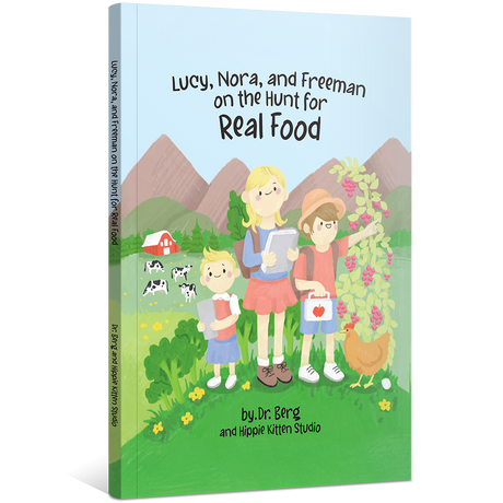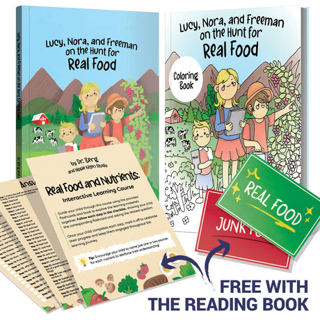 Lucy, Nora, and Freeman on the Hunt for Real Food – Story Book, Coloring Book, Flashcards