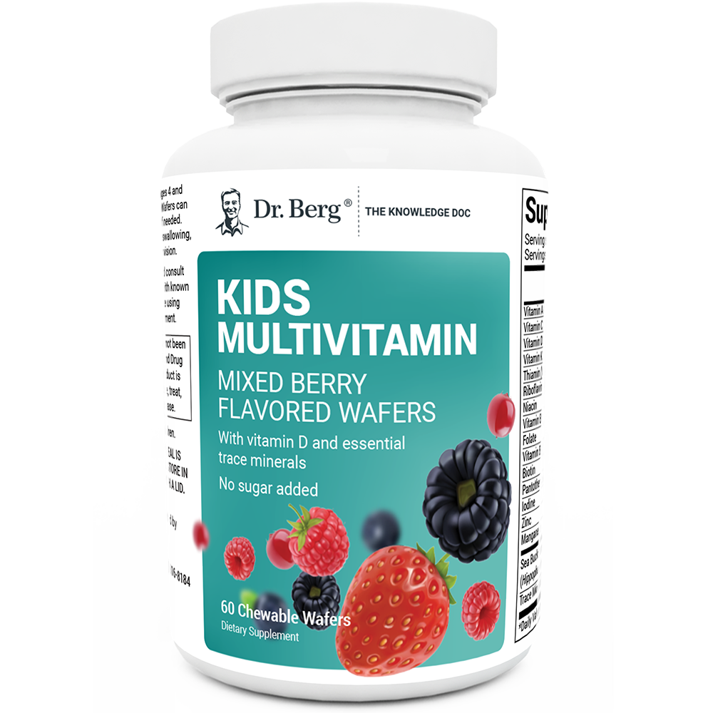 Kids Multivitamin, mixed berry flavored wafers, no sugar added, 60 chewable wafers, front view, bottle with Dr. Berg branding and mixed berries on the cover.