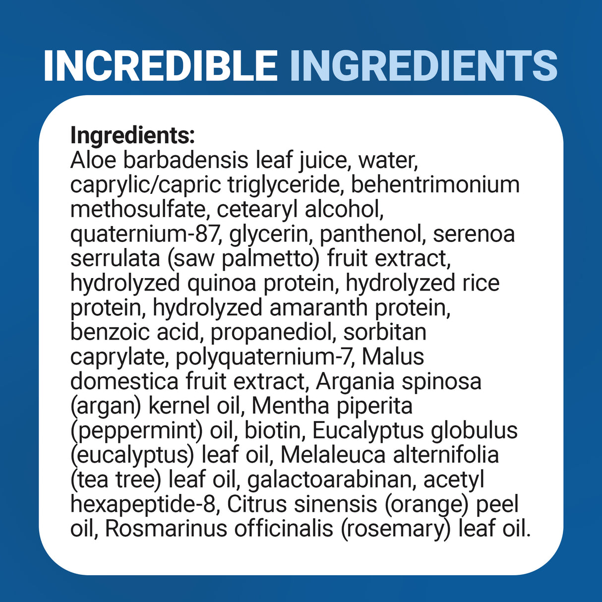 Aloe barbadensis leaf juice, water, caprylic/capric triglyceride, behentrimonium methosulfate, cetearyl alcohol, quaternium-87, glycerin, panthenol, Serenoa serrulata (saw palmetto) fruit extract, hydrolyzed quinoa protein, hydrolyzed rice protein, hydrolyzed amaranth protein, benzoic acid, propanediol, sorbitan caprylate, polyquaternium-7, Malus domestica fruit extract, Argania spinosa (argan) kernel extract, Mentha piperita (peppermint) oil, biotin, Eucalyptus globulus (eucalyptus) leaf oil, Melaleuca alternifolia (tea tree) leaf oil, galactoarabinan, acetyl hexapeptide-8, Citrus sinensis (orange) peel oil, Rosmarinus officinals (rosemary) leaf oil