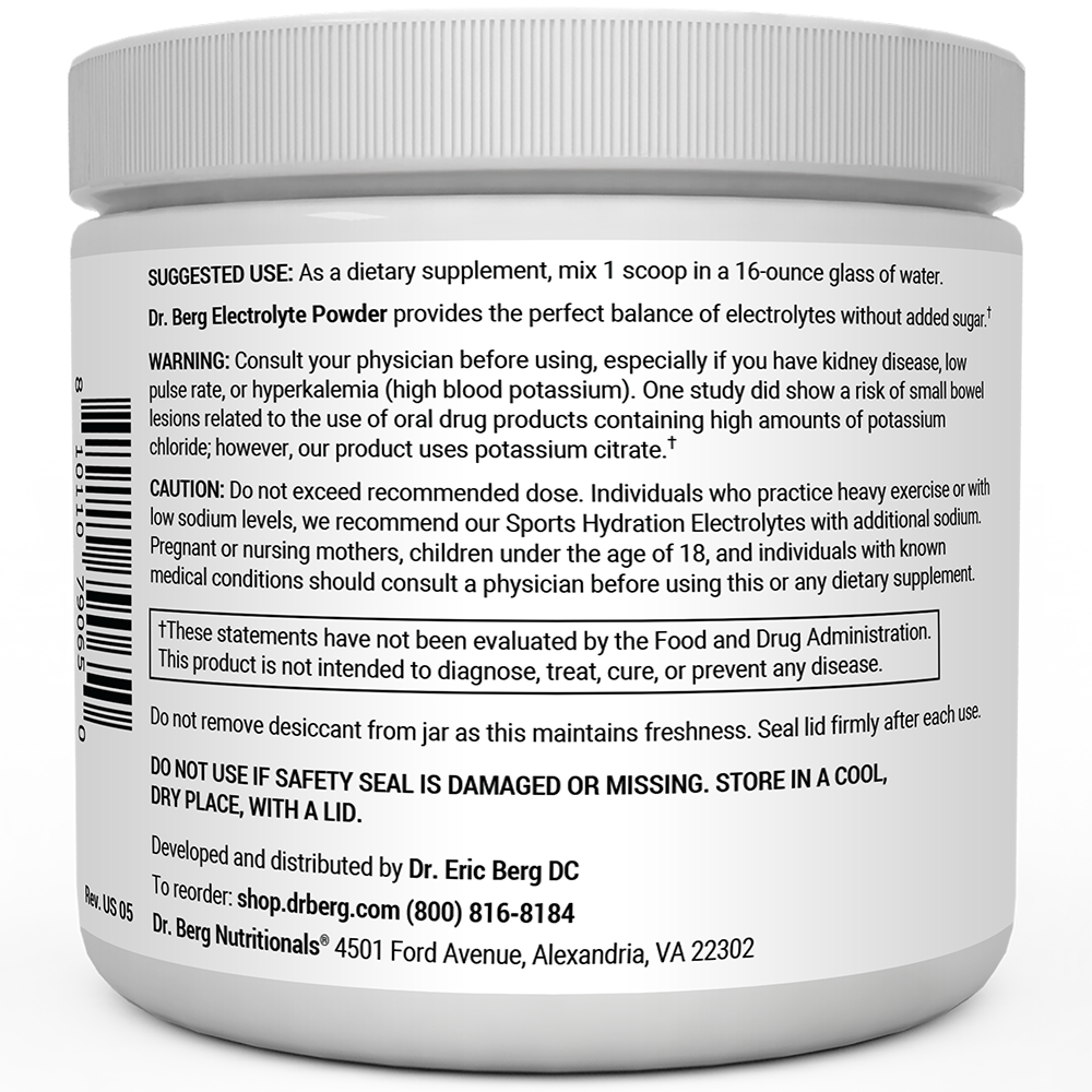 Dr. Berg Electrolyte Powder delivers a high-quality boost of essential electrolyte minerals, featuring an impressive 1000 mg of potassium per serving.