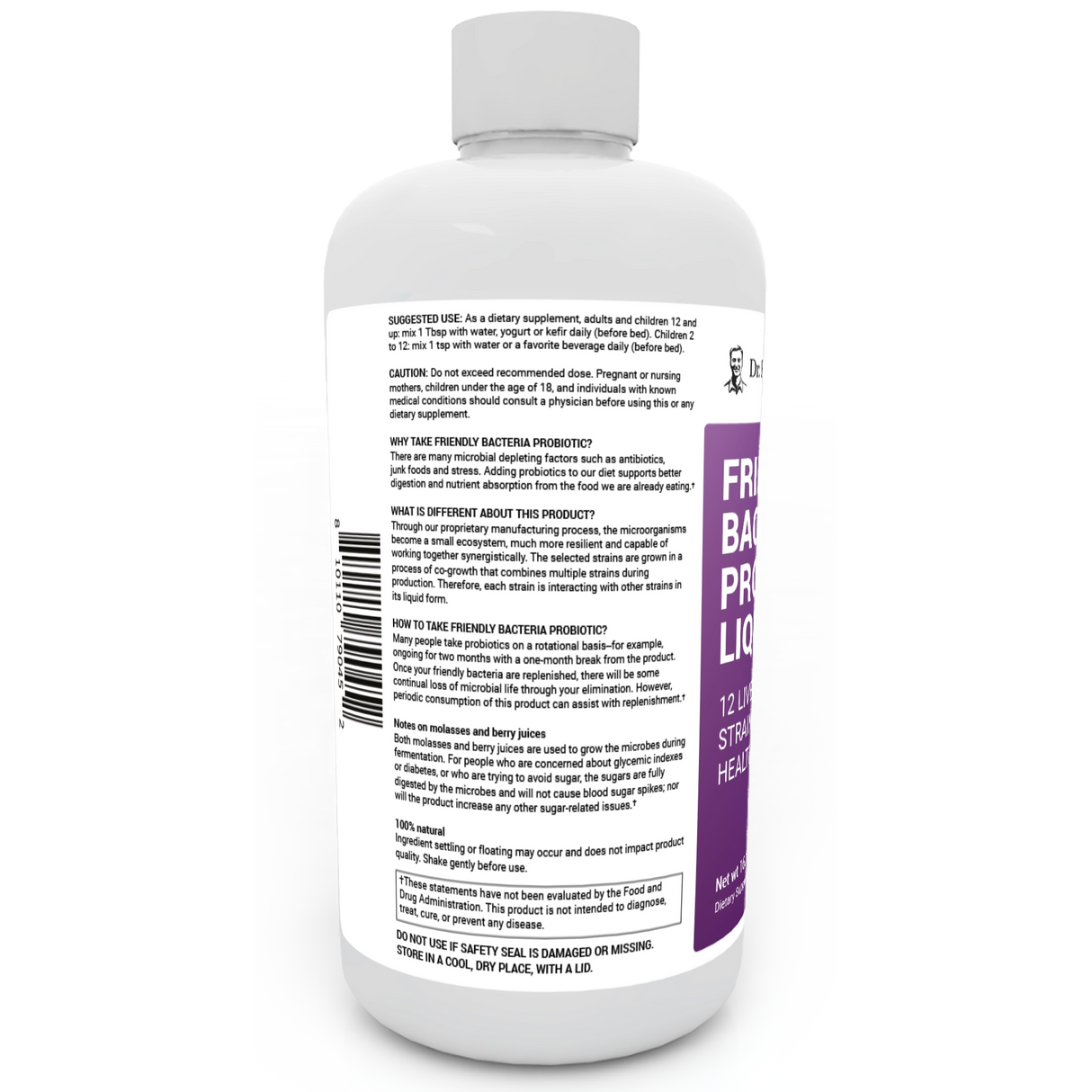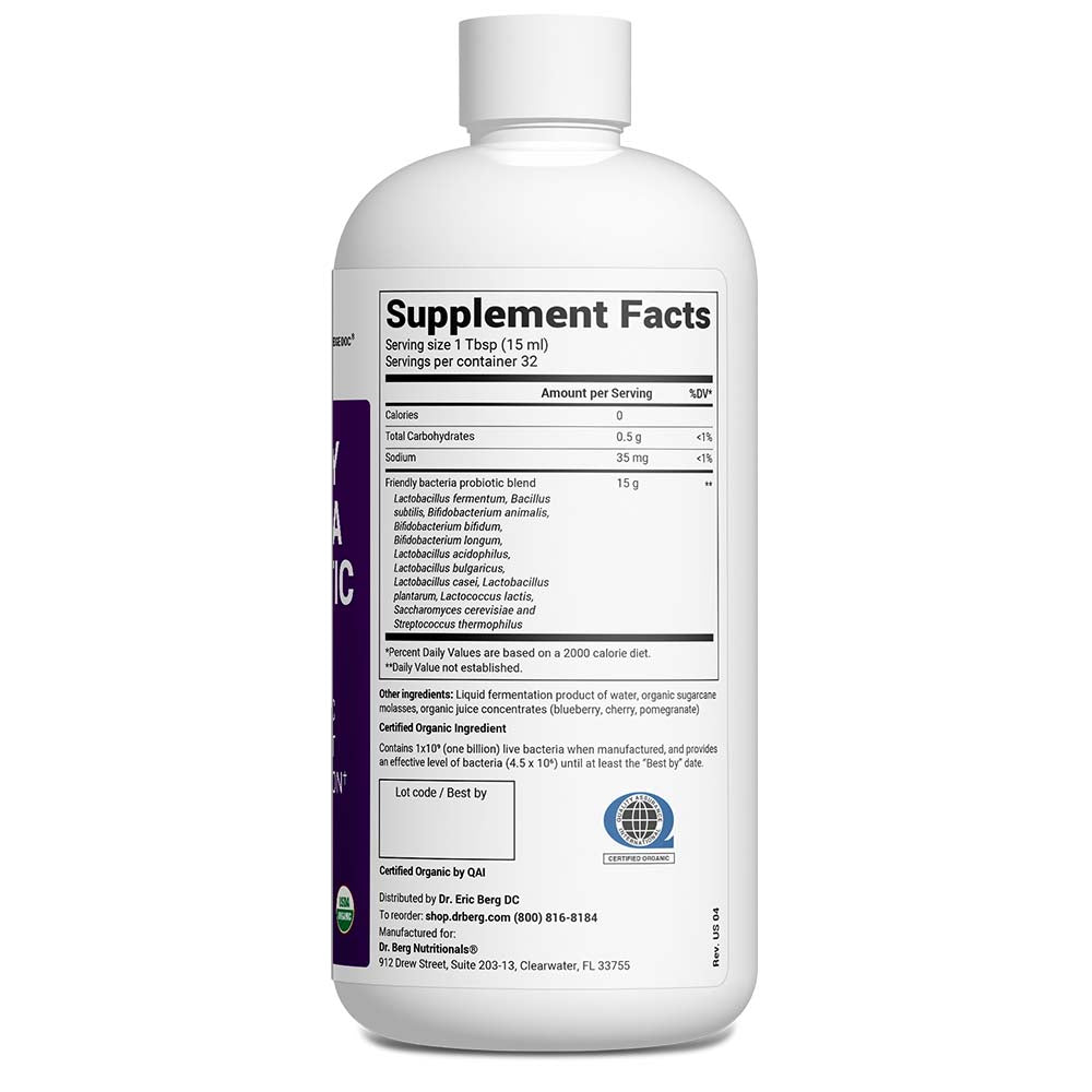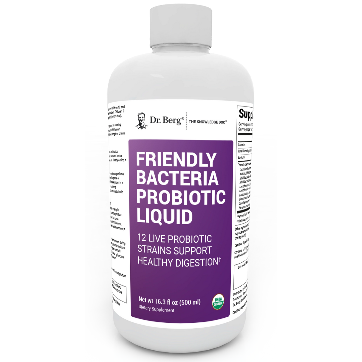 Dr. Berg USDA Organic Friendly Bacteria Probiotic Liquid is a powerful combination of premium ingredients that delivers a daily dose of twelve live probiotic strains.