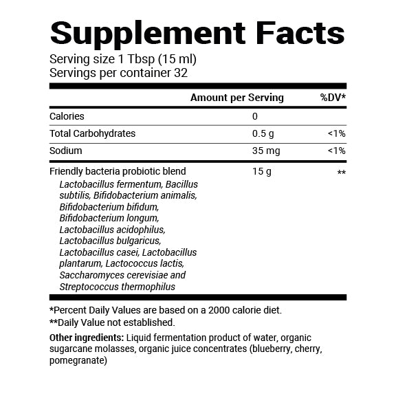 Liquid fermentation product of water, organic sugarcane molasses, organic juice concentrates (blueberry, cherry, pomegranate); contains 1x109 (one billion) live bacteria when manufactured, and provides an effective level of bacteria (4.5 x 106) until at least the “Best by” date