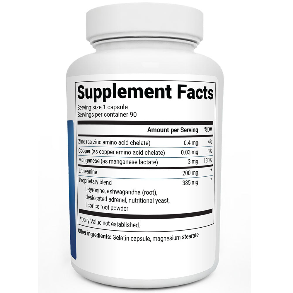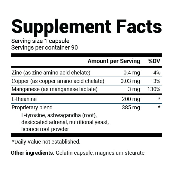 | Proprietary Blend L-tyrosine, ashwagandha root powder, desiccated adrenal substance (bovine), nutritional yeast, licorice root powder |