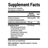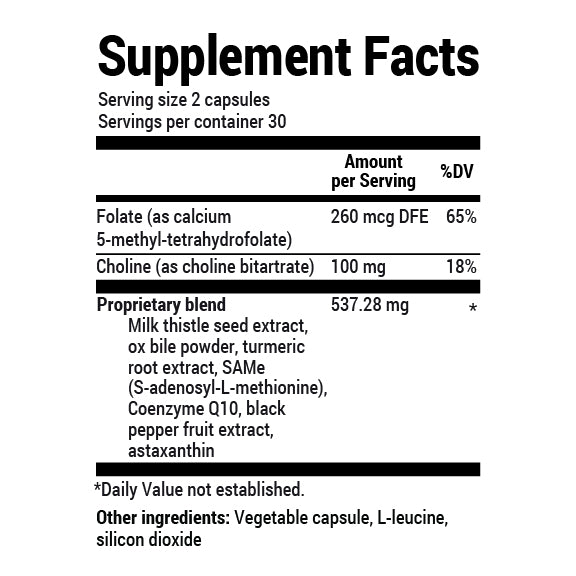 Proprietary blend Choline bitartrate, milk thistle extract (Silybum marianum), ox bile extract, SAM-e (S-adenosylmethionine), turmeric root extract (95% curcumins), coenzyme Q10, astaxanthin, Bioperine® black pepper extract (95% piperine) |