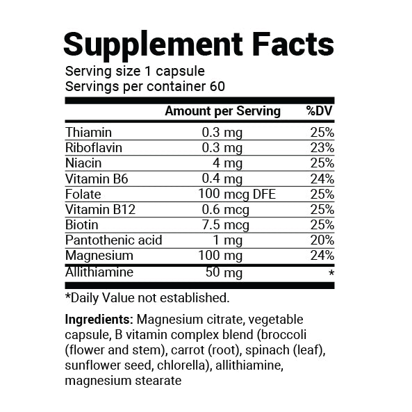 Ingredients: Magnesium citrate, vegetable capsule, B vitamin complex blend (broccoli (flower and stem), carrot (root), spinach (leaf), sunflower seed, chlorella), vegetable capsule, allithiamine, magnesium stearate.
