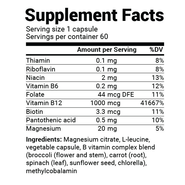 Other Ingredients: Magnesium citrate, L-leucine, vegetable capsule, B vitamin complex blend (broccoli (flower and stem), carrot (root), spinach (leaf), sunflower seed, chlorella), methylcobalamin