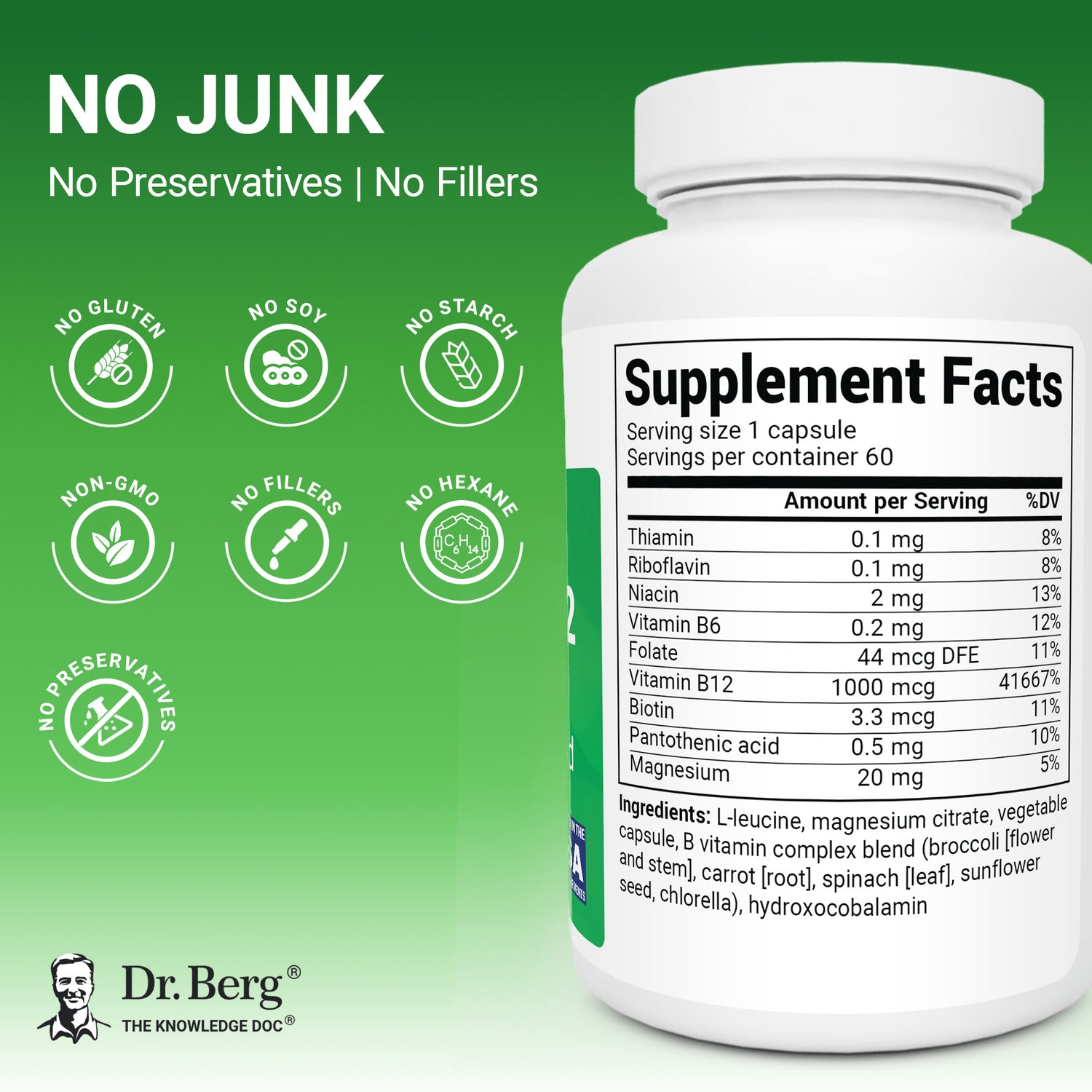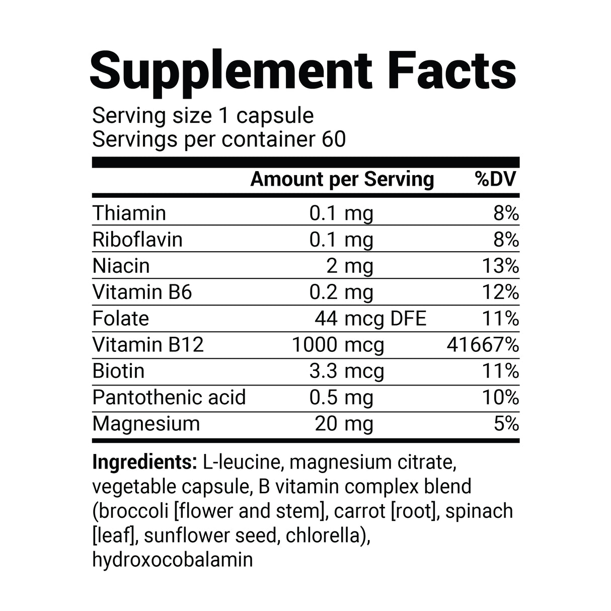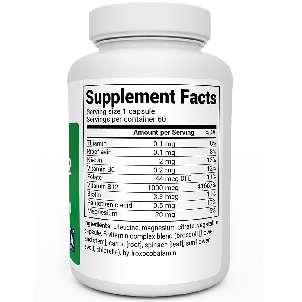 Other Ingredients: L-leucine, magnesium citrate, vegetable capsule, B vitamin complex blend (broccoli (flower and stem), carrot (root), spinach (leaf), sunflower seed, chlorella), hydroxocobalamin