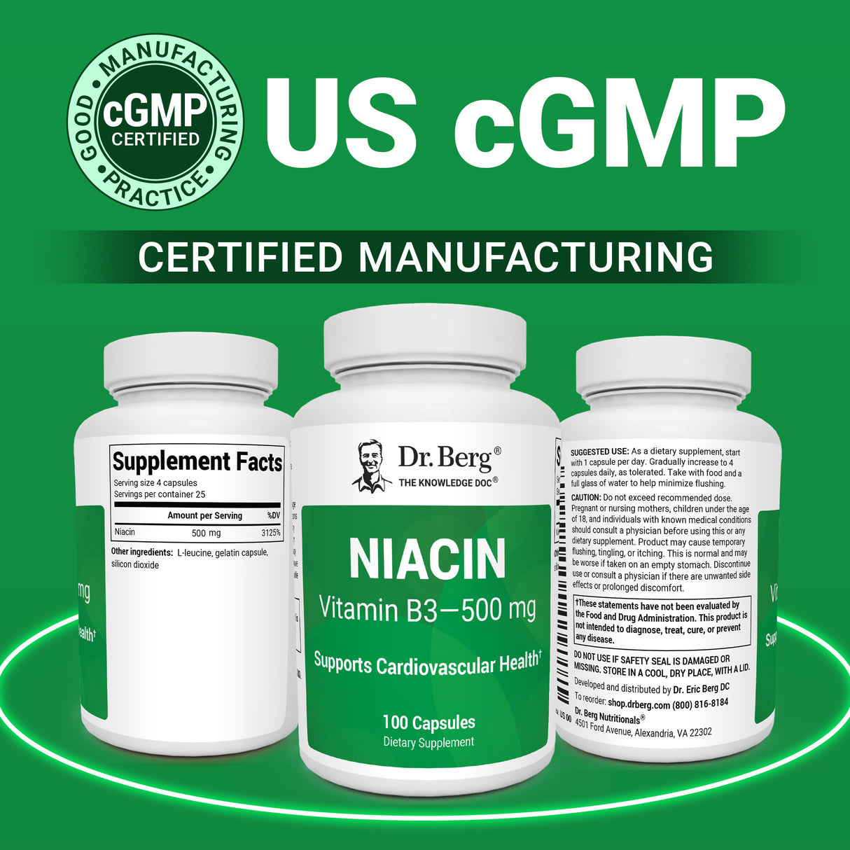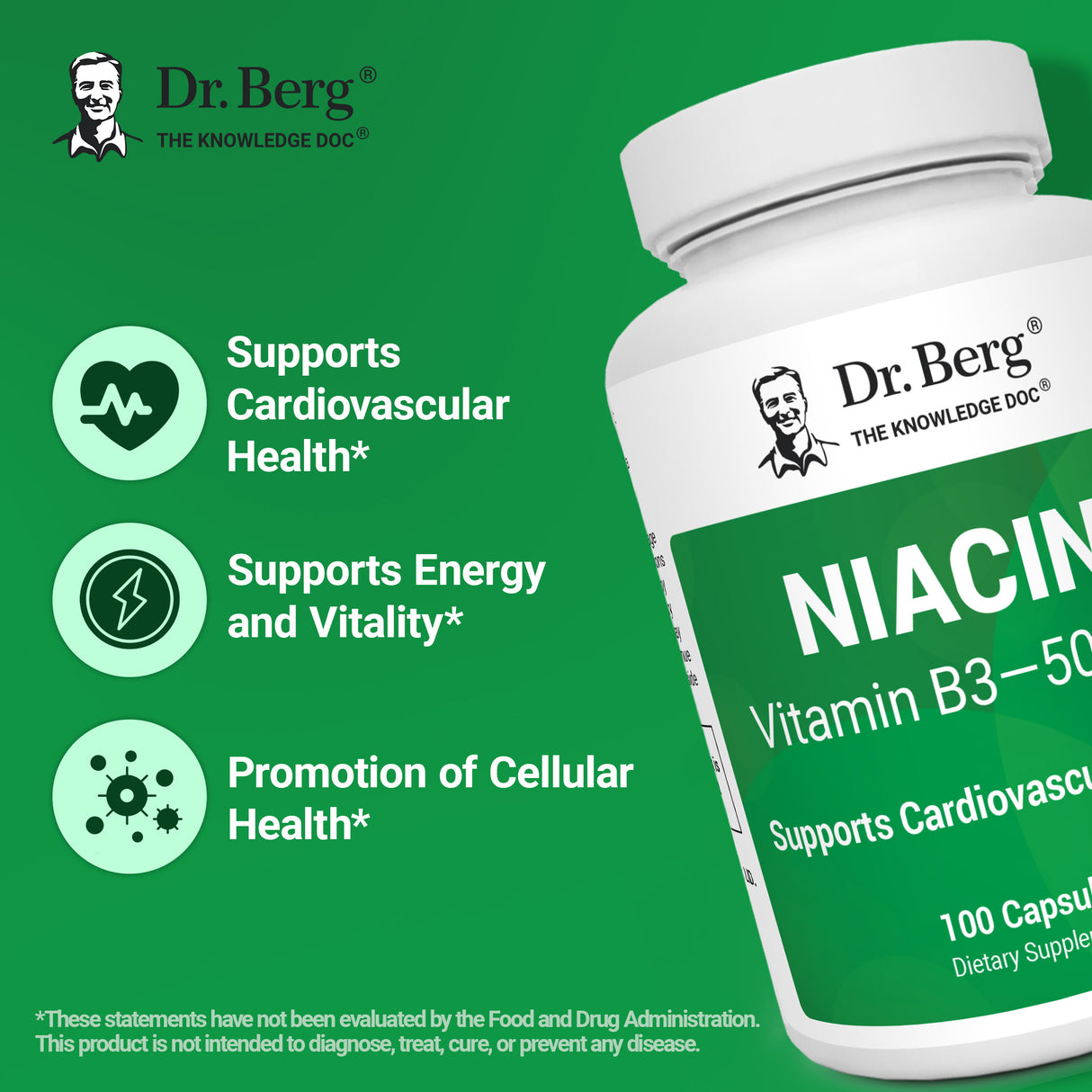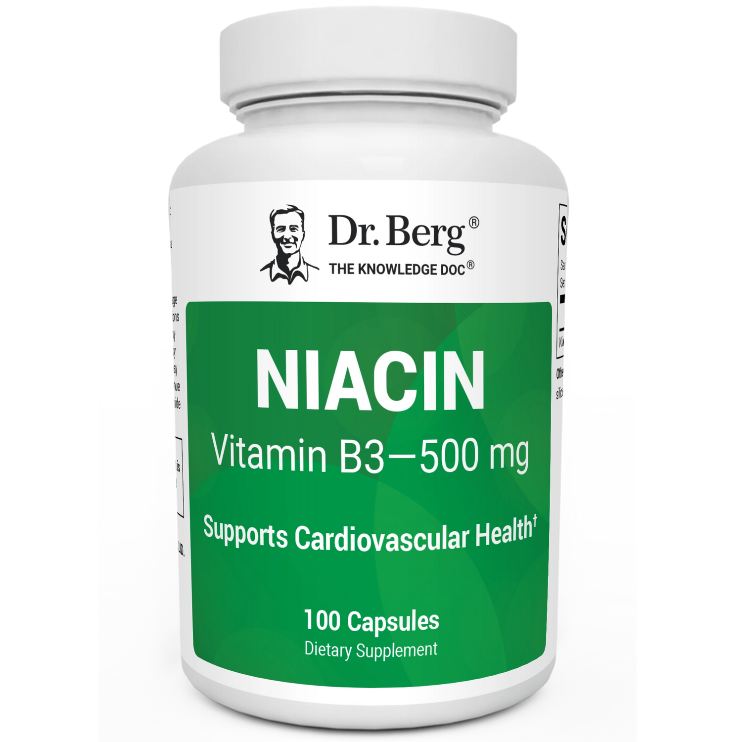 Stay energized, promote cellular health, and support optimal heart function with Dr. Berg Niacin. Each serving delivers an incredible 500 mg of niacin, a premium source of vitamin B3. Convenient 100-day supply of easy-to-swallow capsules in each bottle.