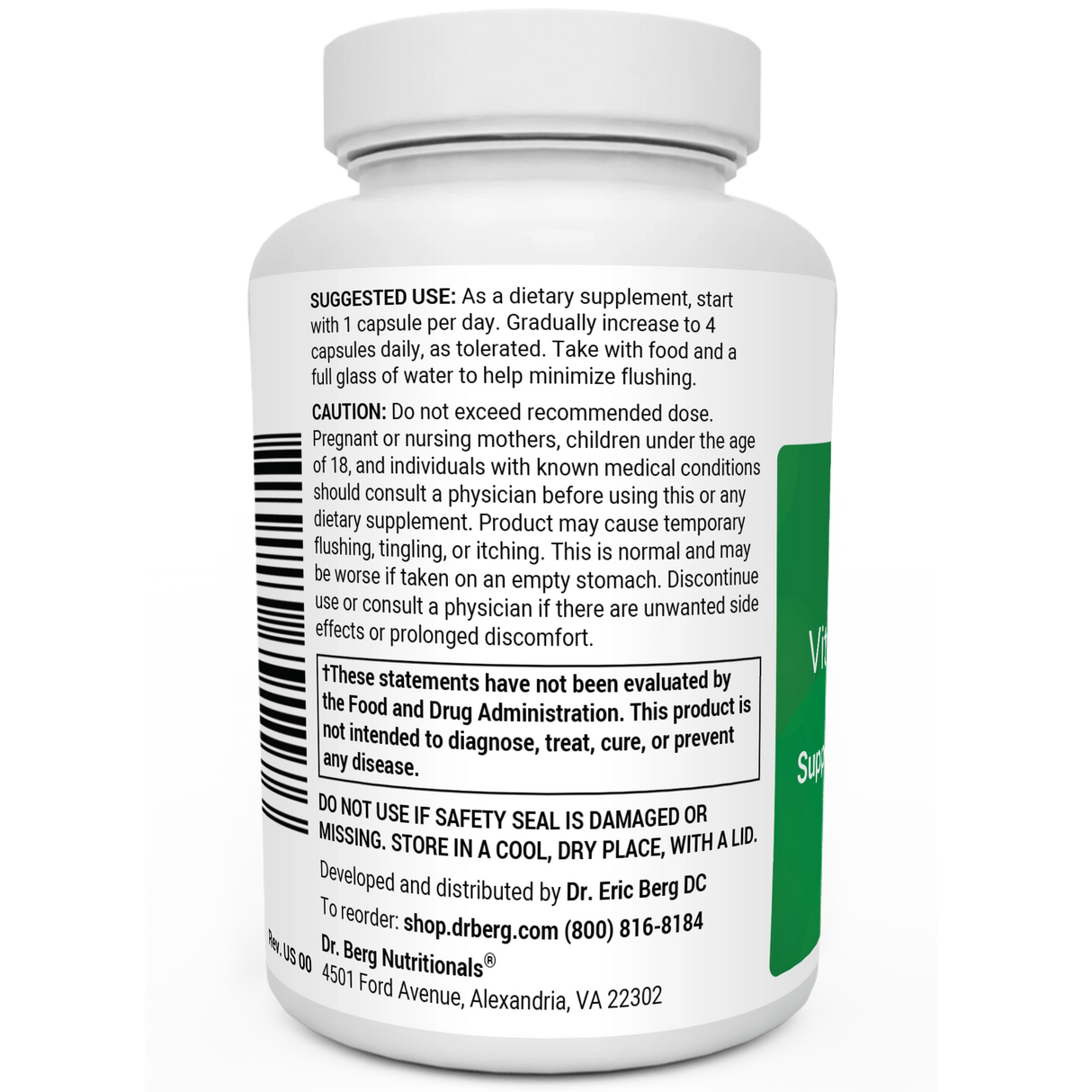 Niacin, 500 mg Vitamin B3, 100 capsules, front view, bottle with Dr. Berg branding on the label.