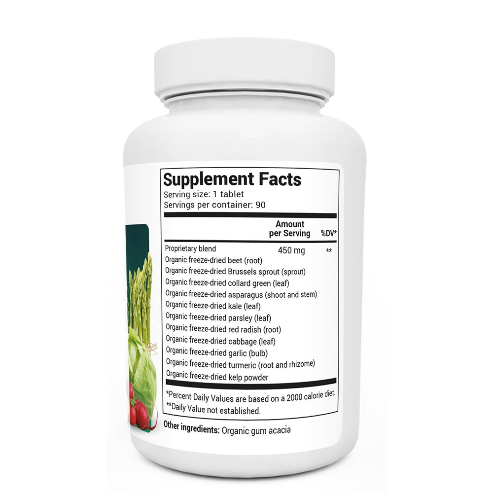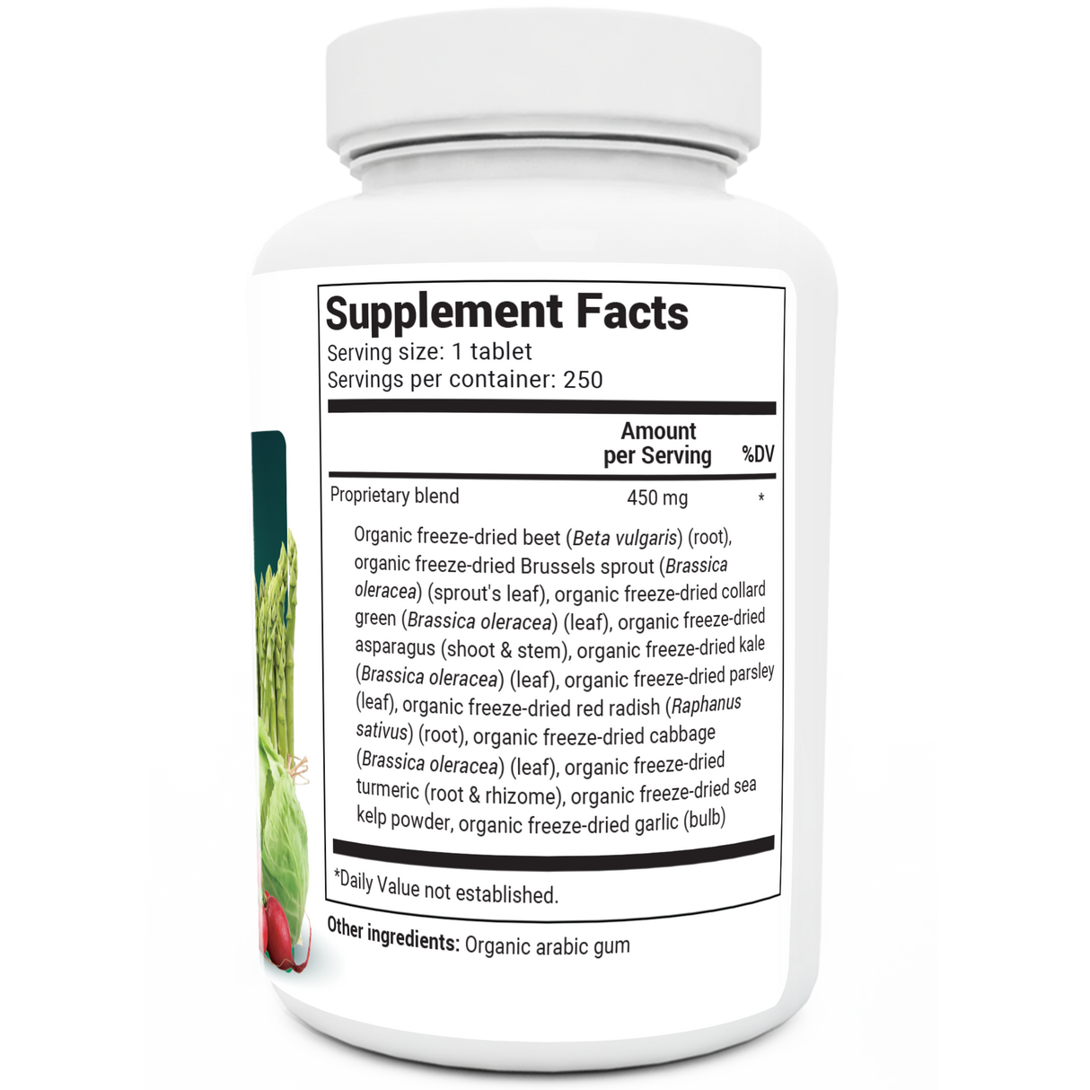 | Proprietary blend Organic freeze-dried beet (Beta vulgaris) (root), organic freeze-dried Brussels sprout (Brassica oleracea) (sprout's leaf), organic freeze-dried collard green (Brassica oleracea) (leaf), organic freeze-dried asparagus (shoot & stem), organic freeze-dried kale (Brassica oleracea) (leaf), organic freeze-dried parsley (leaf), organic freeze-dried red radish (Raphanus sativus) (root), organic freeze-dried cabbage (Brassica oleracea) (leaf), organic freeze-dried turmeric (root & rhizone), organic freeze-dried sea kelp powder, organic freeze-dried garlic (bulb) |