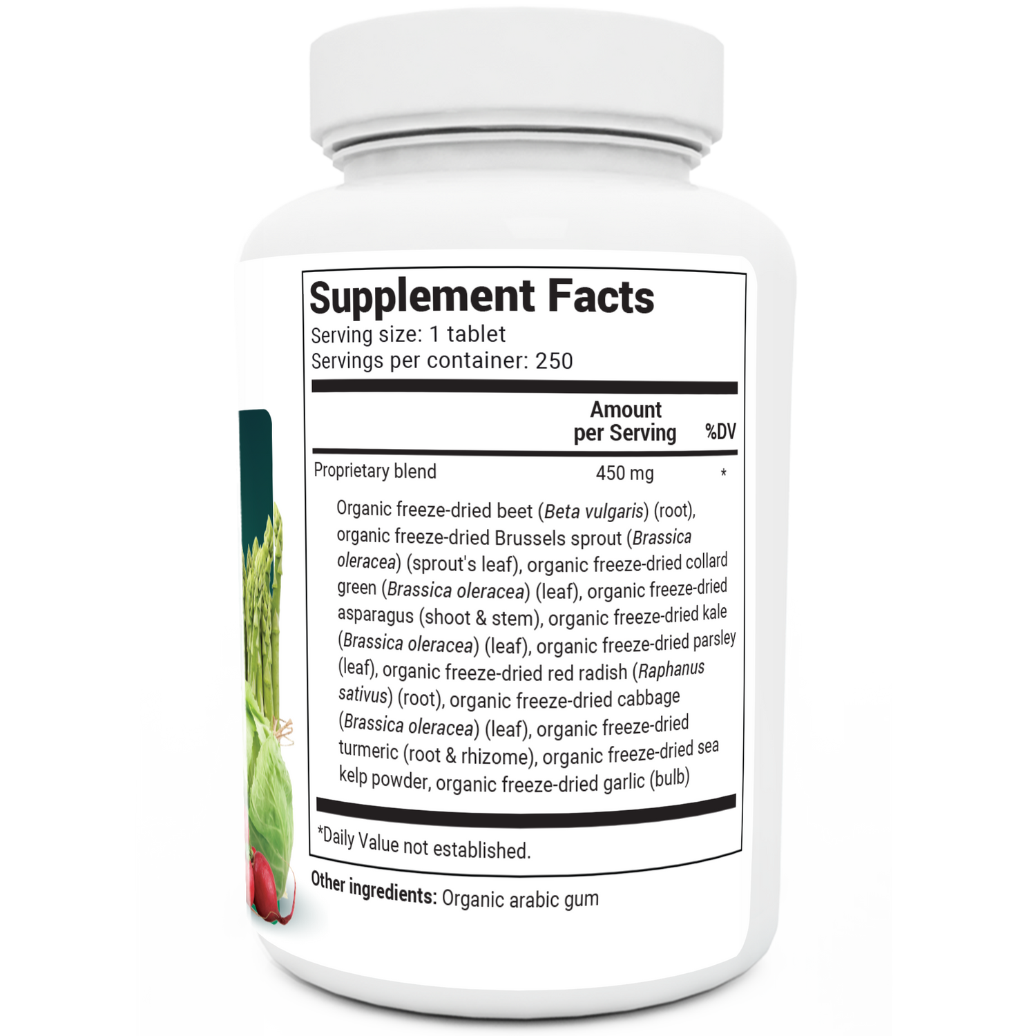 Organic freeze-dried beet (Beta vulgaris) (root), organic freeze-dried brussels sprout (Brassica oleracea) (sprout's leaf), organic freeze-dried collard green (Brassica oleracea) (leaf), organic freeze-dried asparagus (shoot & stem), organic freeze-dried kale (Brassica oleracea) (leaf), organic freeze-dried parsley (leaf), organic freeze-dried red radish (Raphanus sativus) (root), organic freeze-dried cabbage (Brassica oleracea) (leaf), organic freeze-dried turmeric (root & rhizome), organic freeze-dried sea kelp powder, organic freeze-dried garlic (bulb)