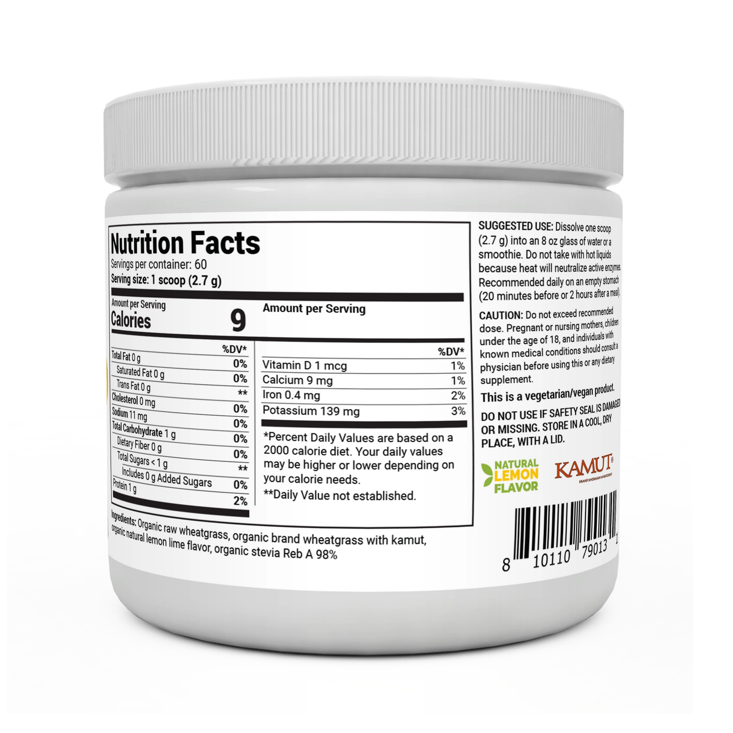 Ingredients: Organic raw wheatgrass, organic brand wheatgrass with kamut, organic natural lemon lime flavor, organic stevia Reb A 98%